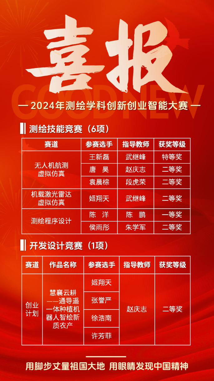 近日,由中国测绘学会教育工作委员会主办的2024年全国老员工测绘学科创新创业智能大赛在滇西应用技术大学圆满落幕。公司本科生经过校级和省级的训练选拔,凭借着扎实的专业知识、高超的技能水平和出色的团队协作能力,在省赛中获9项奖励,其中一等奖3项,即增加3项直通国赛名额,最终在本次大赛中斩获7项国家级奖项,其中特等奖1项,一等奖1项,二等奖5项。细分赛道名单如下: