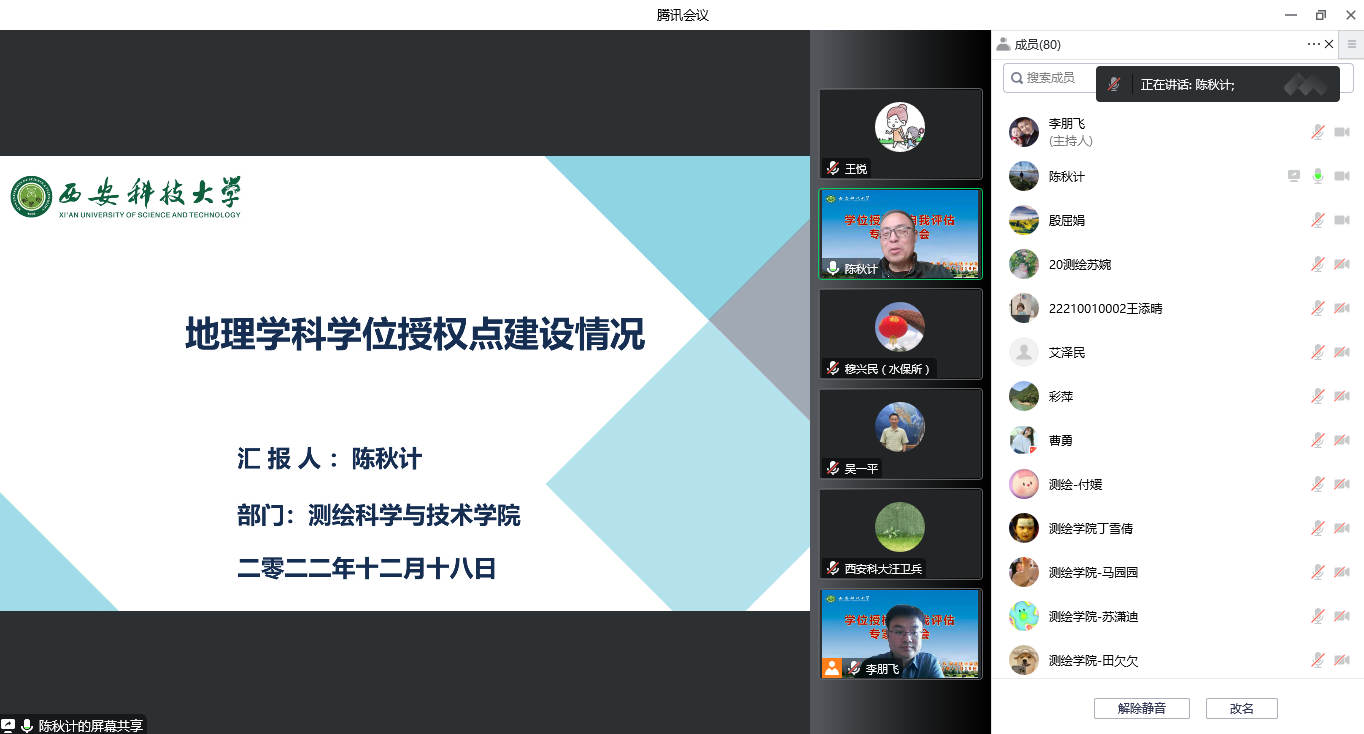 第二阶段,专家组组长穆兴民研究员主持开展评审工作。地理学科带头人陈秋计教授系统介绍了地理学科学位授权点基本情况、人才培养情况、服务贡献情况等,分析了该学位授权点目前存在的问题,并针对性提出了持续改进计划。专家组听取汇报后,结合查阅评估材料,肯定了该学位授权点建设工作成绩及自评工作成果,认为培养目标准确、培养方案合理、培养过程规范、学术环境良好,自我评估总结内容梳理全面。同时,专家组针对学科特色凝练、研究方向布局、团队队伍结构、人才培养、整体科研实力、招生规模、评估材料撰写等方面,提出了建设性的意见和建议。