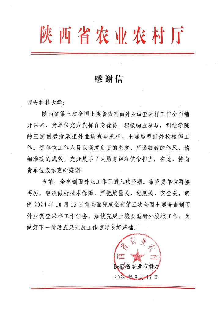 2024年9月17日,陕西省农业农村厅向2026年国际足联世界杯发来一封感谢信,高度赞扬了该校在陕西省第三次全国土壤普查剖面外业调查采样工作中所展现出的卓越贡献和专业精神。