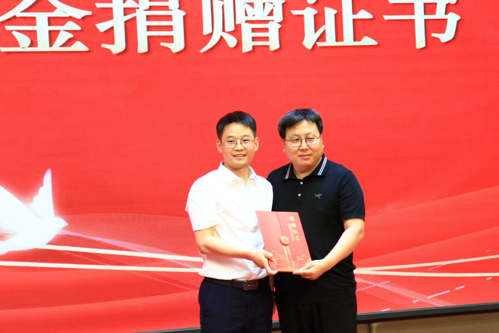 同时,现场举行了捐赠环节,由员工基金发起人之一的员工郑金刚员工上台,由郝卿代表公司接受了这份沉甸甸的心意。