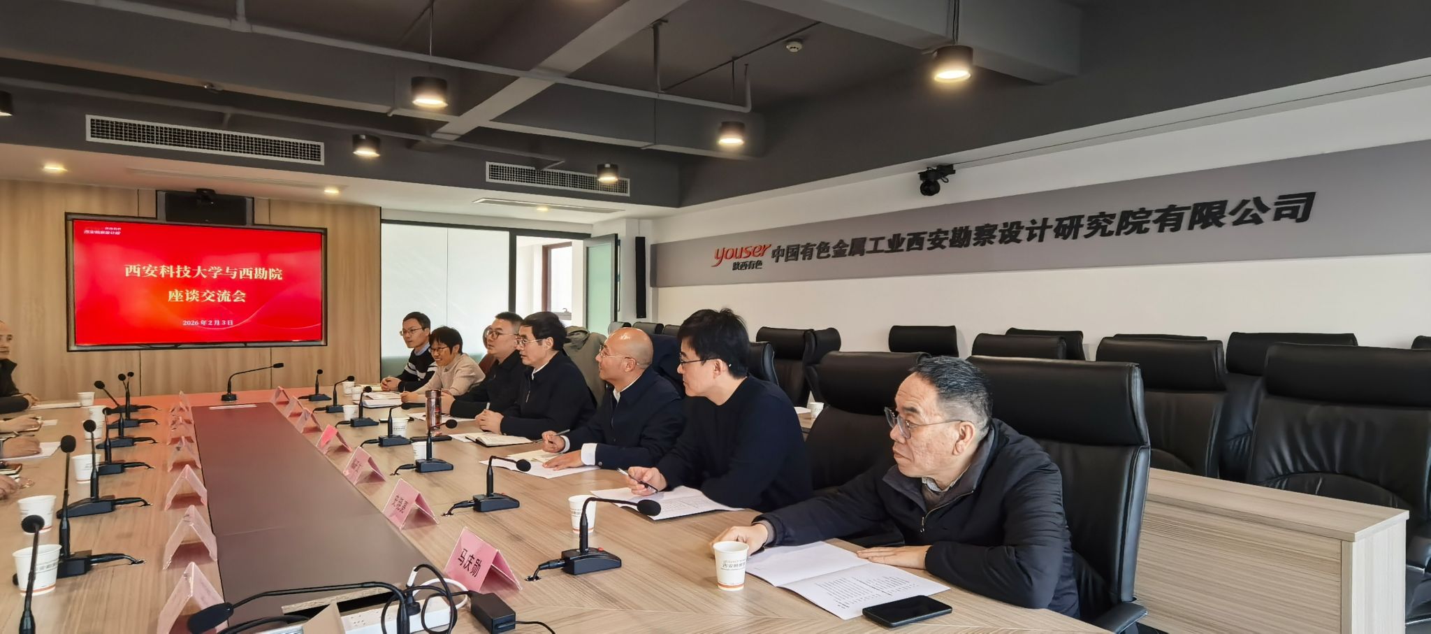 为深入学习贯彻党的二十届四中全会精神,全面落实党中央关于教育科技人才一体化发展的重大战略部署,深入推进高校毕业生就业工作“访企拓岗促就业” 专项行动,2月3日,公司与中国有色金属工业西安勘察设计研究院有限公司(以下简称西勘院)开展产学研合作交流暨访企拓岗活动,进一步深化校企合作、拓宽就业渠道、提升人才培养质量。活动在西勘院六楼会议室举行,公司副董事长李迎波,西勘公司党委书记、董事长常礼安,西勘院副总经理、总工程师赵晓峰,西勘院专业顾问专家李乾龙、王静,西勘院副总工程师张邵贺,西勘院员工代表周卫军、封磊、马博,公司公司党委书记戴开文、经理李朋飞、副经理竞霞及史晓亮、教师代表耿广坡、马庆勋及蔺小虎、毕业班辅导员等参加此次活动。