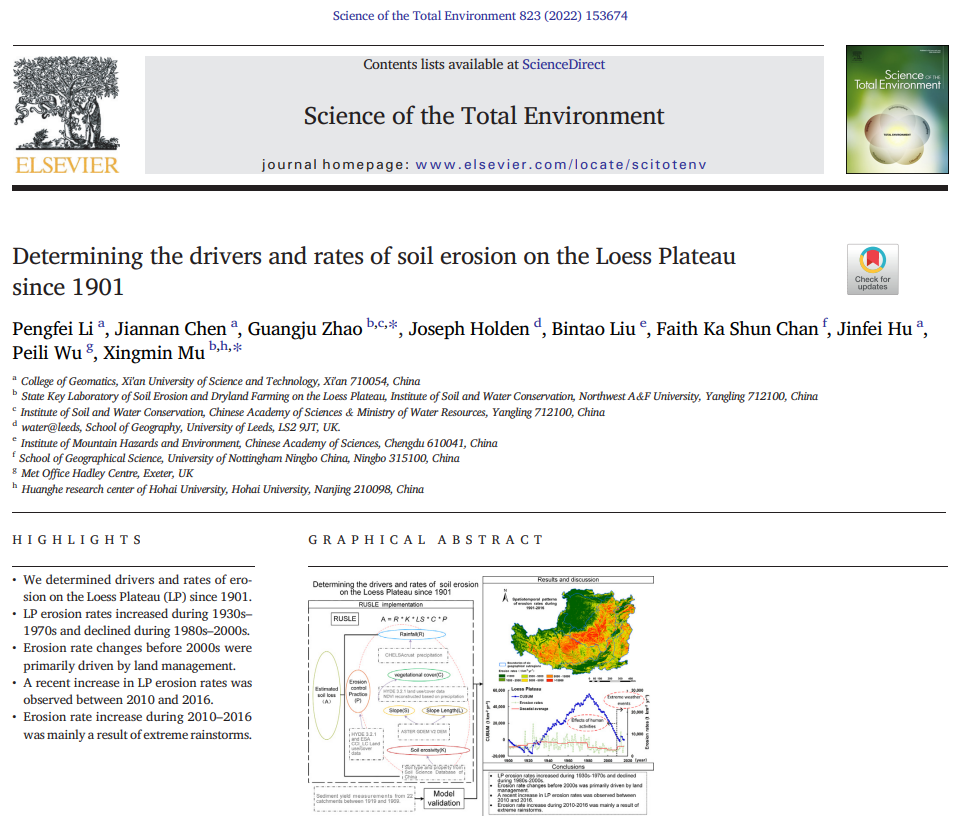近日,公司李朋飞副教授、胡晋飞博士、联合中科院水利部水土保持研究所生态水文团队穆兴民研究员及赵广举研究员、中国科公司成都山地灾害与环境研究所刘斌涛副研究员、英国利兹大学Joseph Holden教授、英国气象中心武培立教授、宁波诺丁汉大学Faith Chan副教授等科研人员,在Science of the Total Environment发表了题为《Determining the drivers and rates of soil erosion on the Loess Plateau since 1901》论文。首次建立1901年-2016年黄土高原土壤侵蚀速率逐年格点数据序列,分析了黄土高原百余年土壤侵蚀的时间及空间演变特征,揭示了土壤侵蚀格局演变的驱动机制,对推动黄河流域生态保护与高质量发展具有重要意义。研究人员通过整理历史时期降水数据、中低分辨率土地利用、土壤属性等资料数据,通过土地利用数据融合并结合历史植被覆盖度模拟,突破历史时期植被覆盖度与水土保持措施分布估算难题,采用修订版通用土壤流失方程(The Revised Universal Soil Loess Equation,简称RUSLE),评估了1901-2016年黄土高原土壤侵蚀年际变化。通过22个受人类活动影响较小的中小流域实测输沙量与RUSLE模型模拟结果对比分析,结果表明模型模拟精度较高,该模型可用于黄土高原土壤侵蚀状况的模拟。 不同年代间侵蚀速率变化表明,20世纪30年代到70年代,黄土高原平均侵蚀速率和侵蚀面积急剧增长,20世纪80年代至21世纪前10年,黄土高原平均土壤侵蚀速率减小,至本世纪初达到最低值。2010年- 2016年期间,平均侵蚀速率再次反弹。2010年之前,土地利用变化是侵蚀速率变化的主要驱动力。人口增长导致的过度森林砍伐和耕作是20世纪30年代至70年代土壤侵蚀急速加剧的主要原因,而水土保持措施及退耕还林还草等政策的实施则导致了后续土壤侵蚀速率逐渐降低。2010年-2016年期间,极端降雨事件频发导致平均土壤侵蚀速率再次增加。未来气候变化下暴雨等极端天气事件或将更加频繁,因而黄土高原亟需创新侵蚀防治策略,保障区域水资源供给的同时减少极端事件中的水土流失灾害风险。