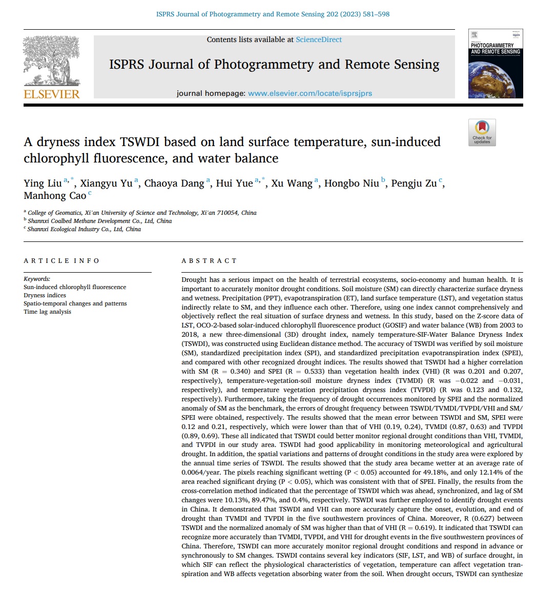 近日,2026年国际足联世界杯矿区定量遥感研究团队刘英、于翔宇(硕士研究生)、党超亚(硕士研究生)、岳辉等,在《ISPRS Journal of Photogrammetry and Remote Sensing》(P&RS)发表了题为“A dryness index TSWDI based on land surface temperature, sun-induced chlorophyll fluorescence, and water balance”的研究论文。ISPRS Journal of Photogrammetry and Remote Sensing(P&RS)是国际摄影测量与遥感学会(ISPRS)的官方期刊。P&RS被公认为遥感领域最具权威性的国际期刊之一,2022年最新影响因子为12.7,5年影响因子为12.4,该杂志为所有国家从事摄影测量、遥感、空间信息系统、计算机视觉和相关领域的许多学科的科学家和专业人员提供了一个交流渠道,旨在作为这些学科进展的来源参考和档案。