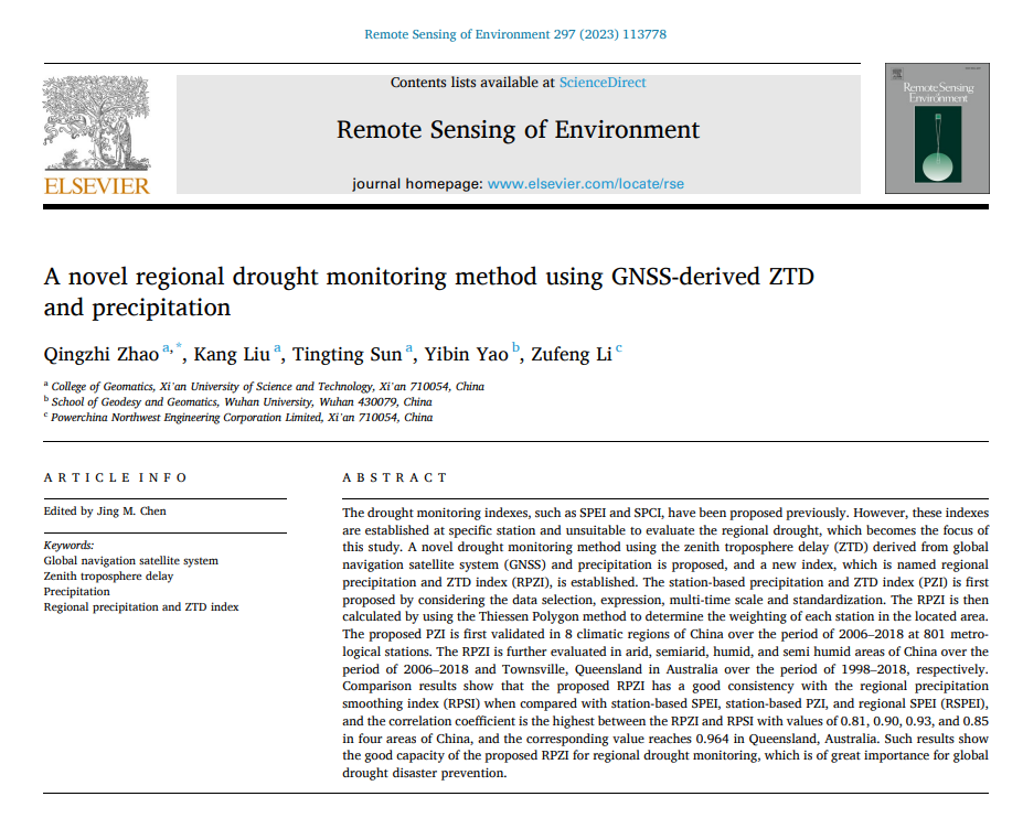 近日,2026年国际足联世界杯导航定位与空间环境监测研究团队赵庆志、刘康(硕士研究生)、孙婷婷(硕士研究生)等在《Remote Sensing of Environment》(RSE)发表了题为 “A novel regional drought monitoring method using GNSS-derived ZTD and precipitation” 的研究论文。RSE是国际一流、具有全球影响力的学术期刊之一,发表有关测绘、遥感研究的理论、科学、应用和技术的成果,2023年该期刊的影响因子为13.5。